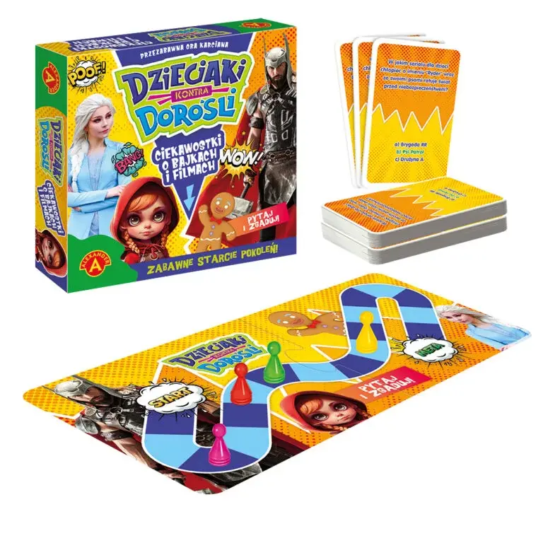 Co mogło obudzić Śpiącą Królewnę? Jak nazywa się syn Homera Simpsona? Gdzie mieszkają Muminki? Czy jesteście gotowi na wyjątkowe starcie pokoleń w przezabawnej grze karcianej? Tutaj dzieciaki rywalizują z dorosłymi, odpowiadając na podchwytliwe pytania. Zabłyśnij wiedzą o filmach i bajkach i zostań zwycięzcą!