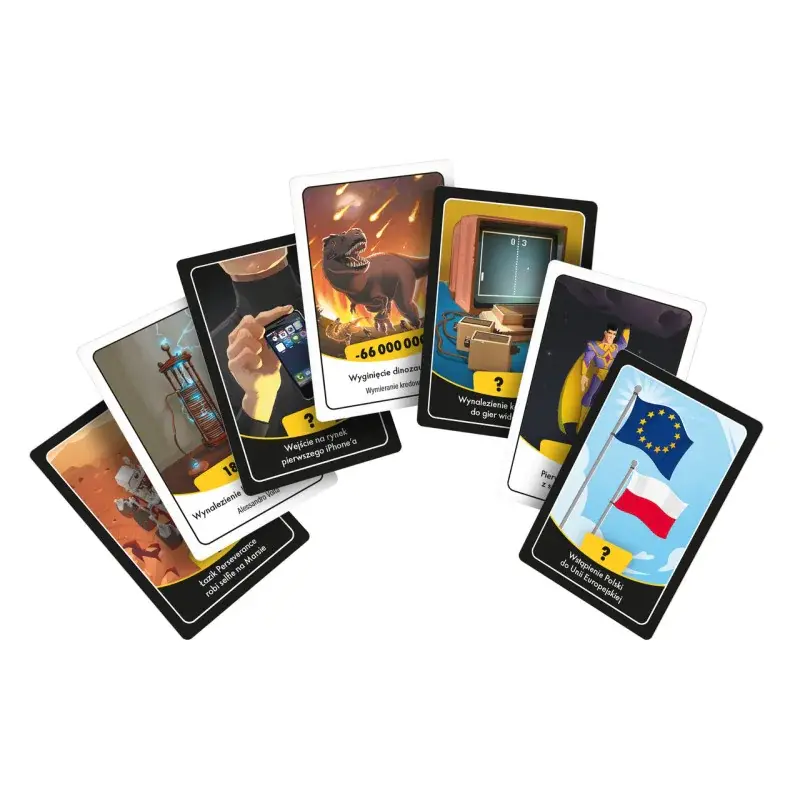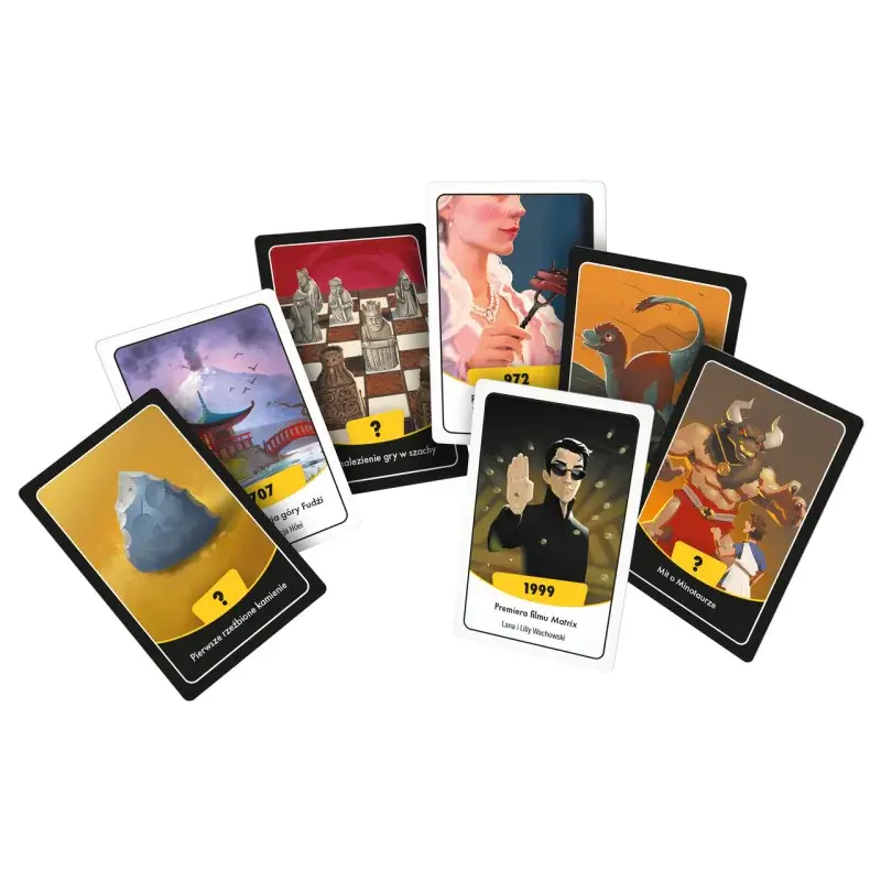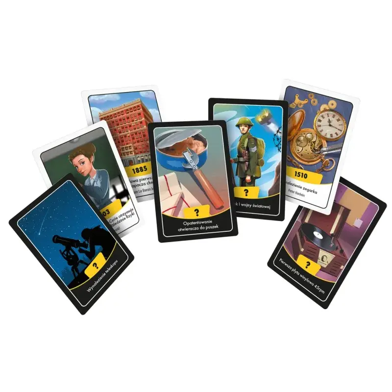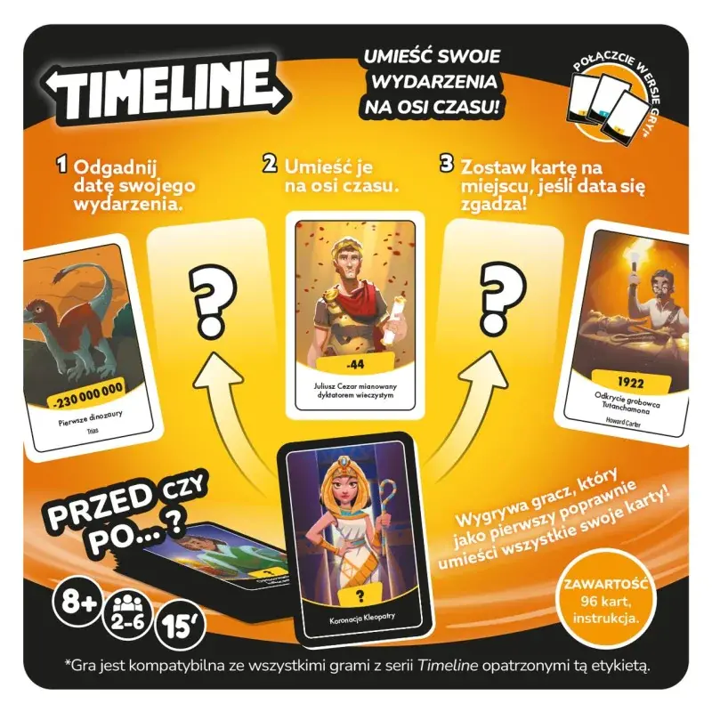 Jak sądzisz, co zostało wynalezione najwcześniej: szczoteczka do zębów, zegarek, a może teleskop? Który z cudów świata starożytnego zaczął być budowany najpóźniej? Czy ołówek we współczesnej formie jest z nami dłużej niż zapałki? Na te i inne pytania odpowie Timeline – niezwykle przyjemna karcianka dla całej rodziny, w której wspólnie tworzymy oś czasu z wylosowanych kart wydarzeń. W pudełku znajdziesz 96 kart z historii ogólnej, od prehistorii aż po współczesność.