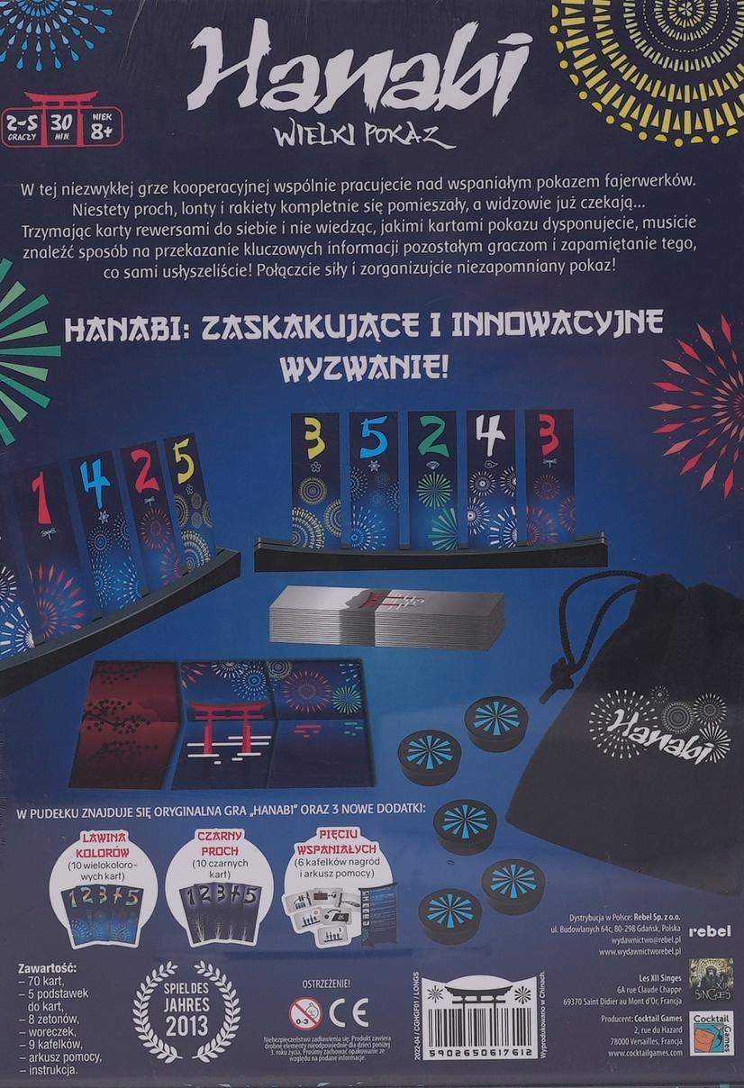Skuteczna współpraca jest kluczem do sukcesu. Ale co w przypadku, gdy sami nie wiecie, jakie karty posiadacie? Hanabi: Wielki pokaz to wyjątkowa gra kooperacyjna, w której z pomieszanych lontów, rakiet i prochu próbujecie poskładać odpowiednie zestawy. Musicie znaleźć sposób na przekazanie kluczowych informacji pozostałym graczom i zapamiętanie tego, co sami usłyszeliście. Połączcie siły i zorganizujcie niezapomniany pokaz!