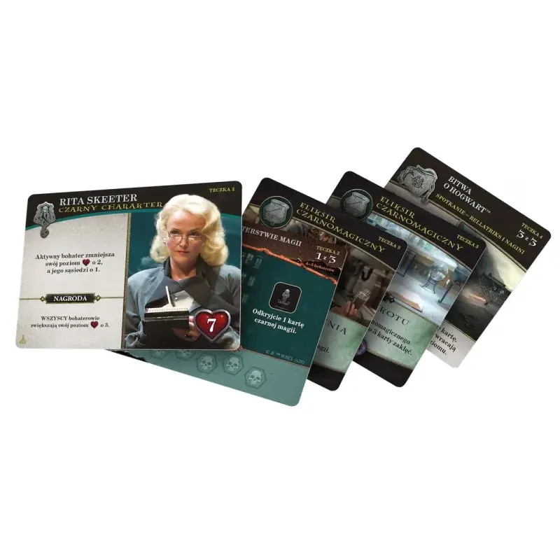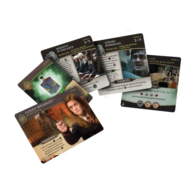 To kooperacyjna gra karciana w której, jako HARRY POTTER™, RON WEASLEY™, HERMIONA GRANGER™ i NEVILLE LONGBOTTOM™, stawiacie czoła serii mrocznych zdarzeń w tytułowej szkole dla czarodziejów. W trakcie gry zmierzycie się z drużyną czarnych charakterów, którzy stopniowo, miejsce po miejscu, próbują podporządkować sobie świat czarodziejów.