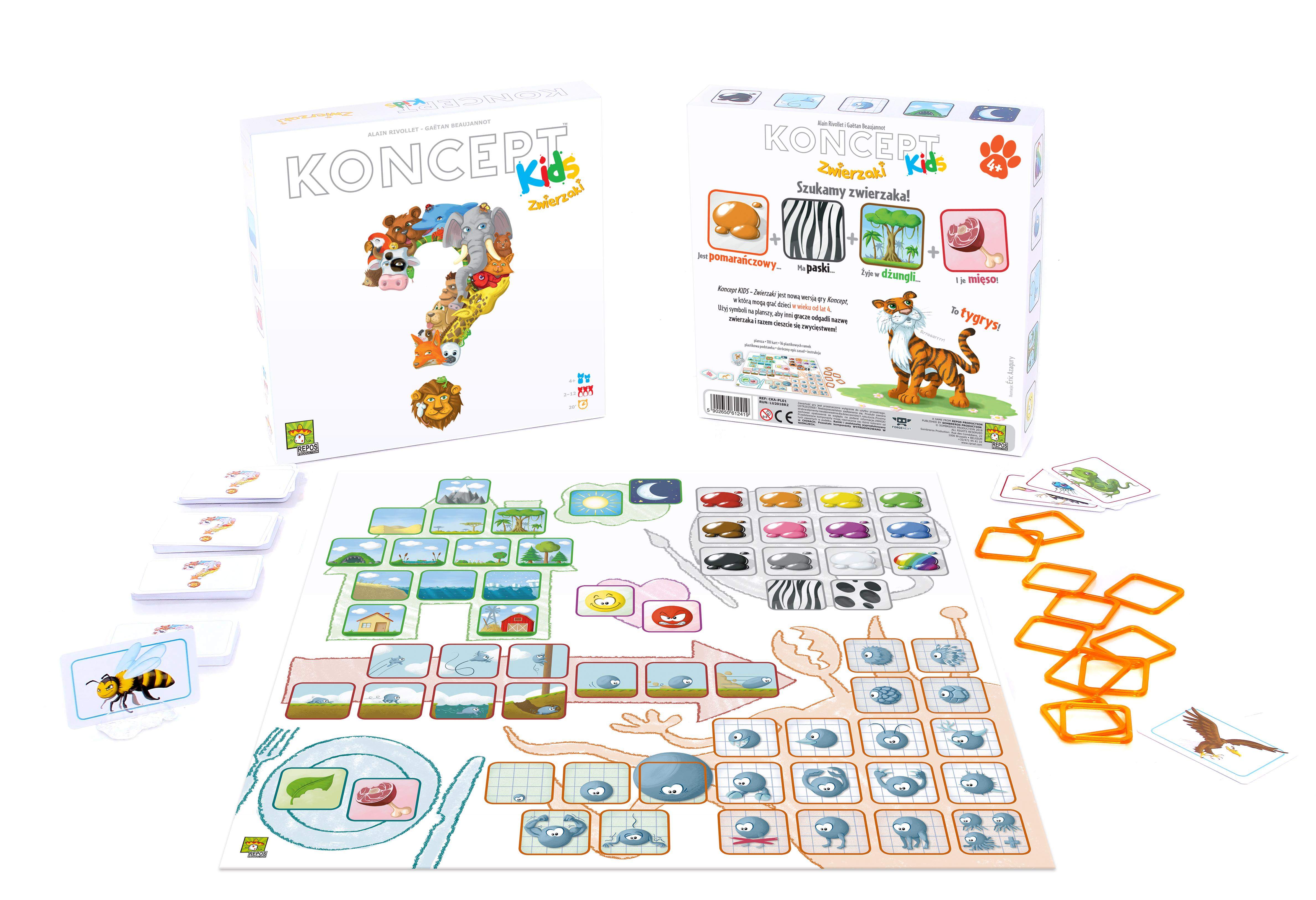 Wskazując symbole na planszy, pomóż innym członkom rodziny odgadnąć jak najwięcej haseł i razem cieszcie się zwycięstwem! Koncept Kids: Zwierzaki to oparta na współpracy wersja gry Koncept przeznaczona dla dzieci od 4 roku życia.