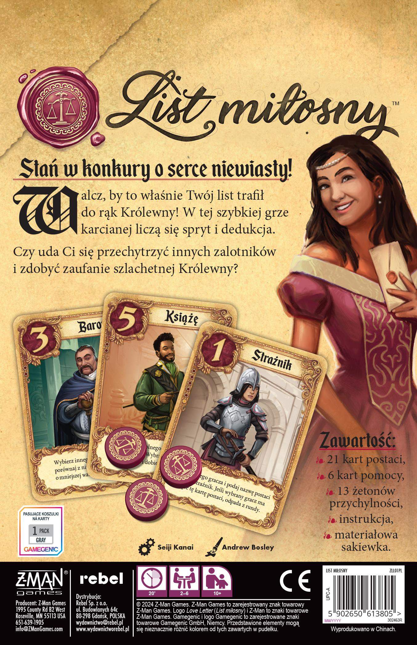 Rozgrywka w List miłosny trwa kilka rund, podczas których wykorzystujesz sojuszników, przyjaciół i członków rodziny królewskiej, aby doręczyli Królewnie napisany przez Ciebie list miłosny. Karta na ręce symbolizuje postać, która aktualnie niesie Twój list. Ta postać może się jednak zmienić w trakcie rundy, w miarę jak będziesz dobierać i zagrywać karty.