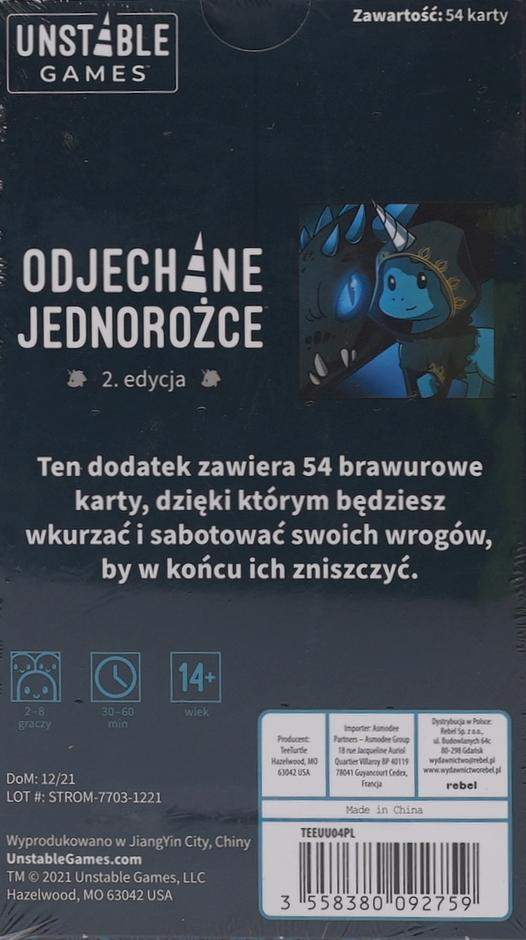 Odjechane Jednorożce: Smoki to rozszerzenie składające się z 54 zupełnie nowych kart, które wprowadzą do Twoich rozgrywek fantastyczne stworzenia: od smokorożków, poprzez dojrzałe osobniki aż do zwykłych jednorożców, które marzą, by zostać smokami. Możesz je łączyć zarówno z klasyczną grą podstawową, jak i wersją Bez cenzury.