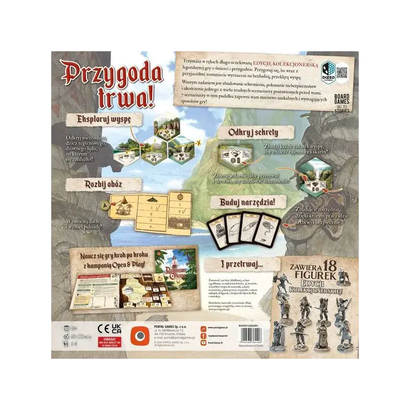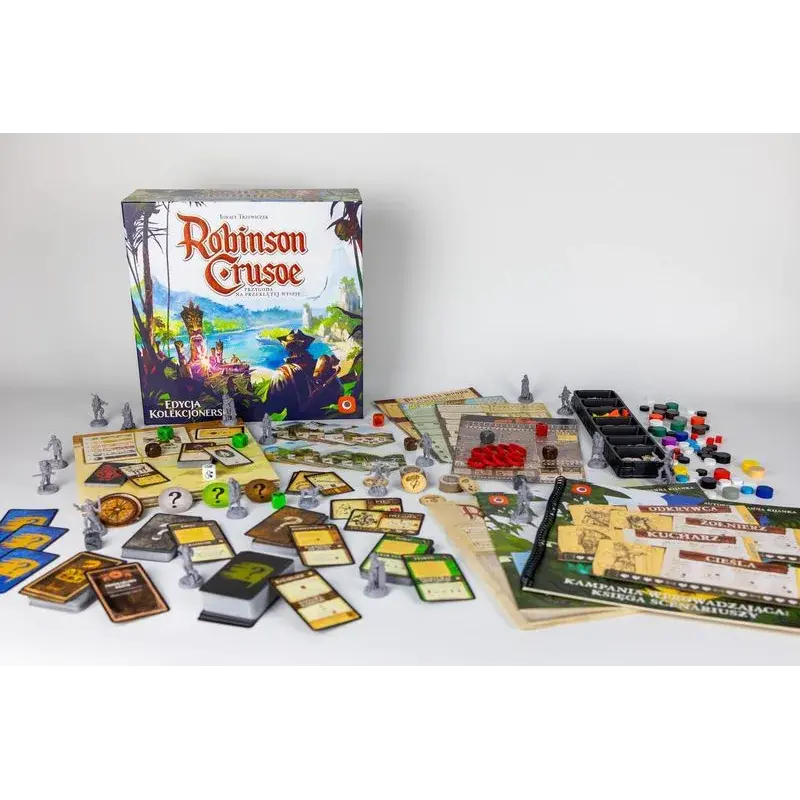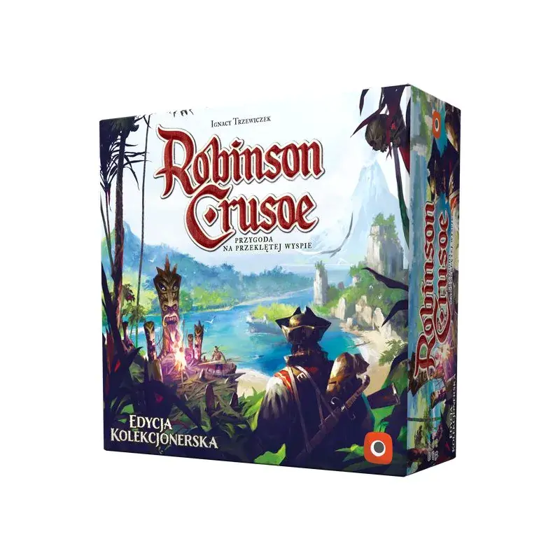 Robinson Crusoe: Przygoda na Przeklętej Wyspie - bestsellerowa gra kooperacyjna dla 1 do 4 graczy autorstwa Ignacego Trzewiczka. Edycja Kolekcjonerska to wyjątkowe wydanie rozbudowujące klasyczną wersję o Kampanię Wprowadzającą, która krok po kroku uczy zasad gry, zestaw 18 wysokiej jakości figurek i plastikową wypraskę w nowym, powiększonym pudełku, mieszczącym wszystkie komponenty.