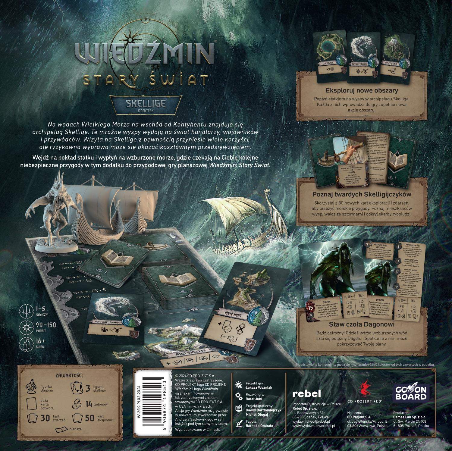 Rozszerzenie Wiedźmin: Stary Świat - Skellige wprowadza do gry dużą dodatkową planszę z 3 nowymi lokacjami: Ard Skellig, Wyspą Mgieł i Eyną (wyspą na wschodzie, dotąd nieznaną). Oznacza to więcej przestrzeni do podróży i zupełnie nowe akcje do przeprowadzenia. Na wyspy będziemy mogli dostać się z 6 portów na Kontynencie, a że nie każdy kapitan chętnie się tam wybiera, zarówno liczba statków, jak i miejsc na nich, jest ograniczona. Dodatkowo z podróżami na Skellige wiążą się nowe karty eksploracji pełne różnorodnych i ekscytujących historii, rzucających graczy na głębokie wody przygód.